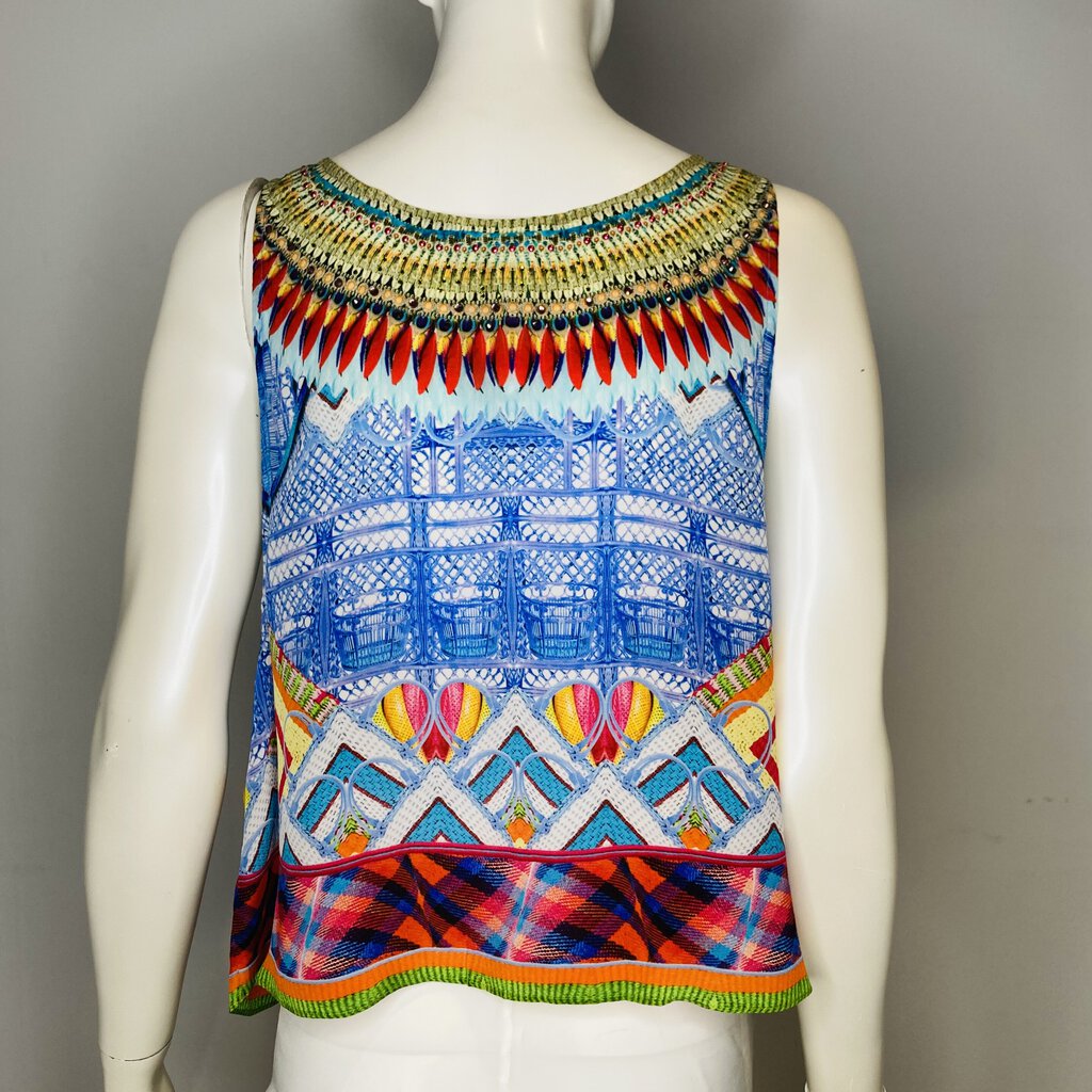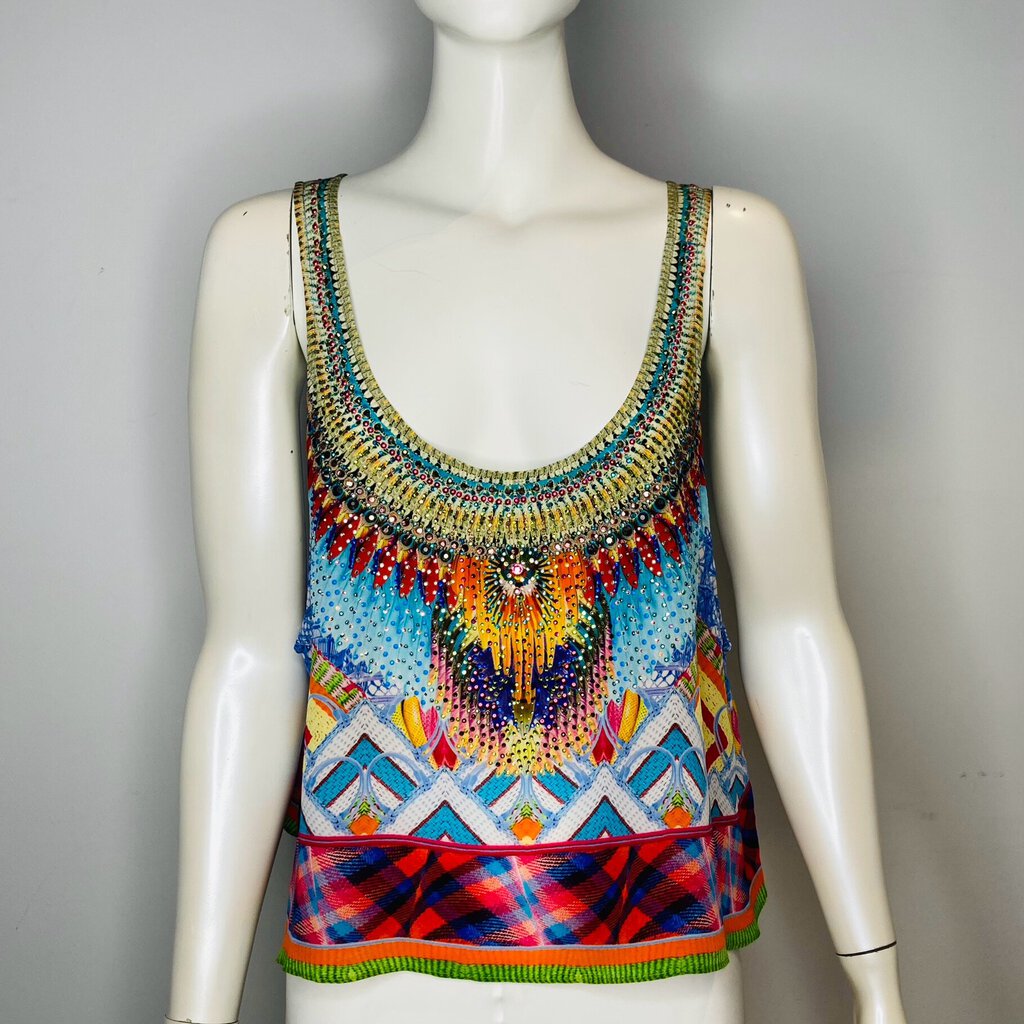 DescriptionCamilla Silk Top Crossing Paths Print Cropped Sleeveless Style Swarovski EmbellishmentsSize 2Condition: Very Good Preloved Condition