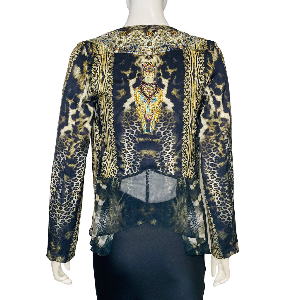 DescriptionCamilla Fitted JacketAnimal Print Swarovski Feature Details Lapel Front with Long Sleeves & Draped Back Size 1Condition: Very Good Pre-Loved Condition