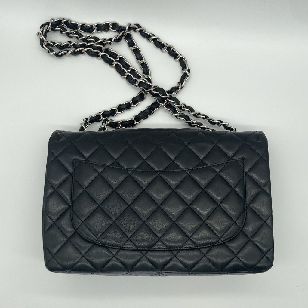 Chanel Classic 2.55 Lambskin Jumbo Bag in Black with Silver Toned Hardware.