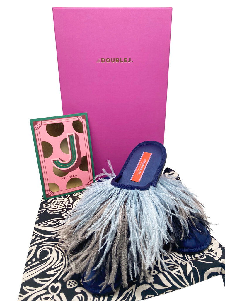 La DoubleJ is celebrated for expressive design and playful elegance, and these feather slippers capture the brand’s distinctive sense of occasion. The combination of luxurious texture and relaxed silhouette creates a statement piece with refined styling.