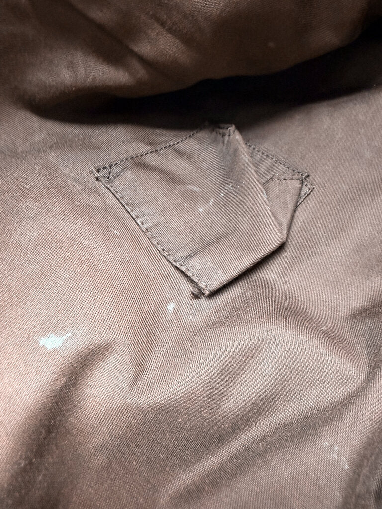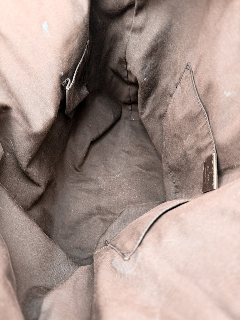 Markings on interior and some on exterior (pictured). Some slight fraying on bottom corner as expected.