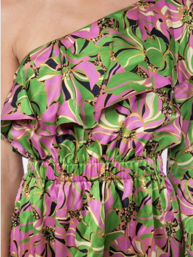 Single Sleeve Midi Dress with Frill Neckline & Hem in Floral Print with Side Pockets