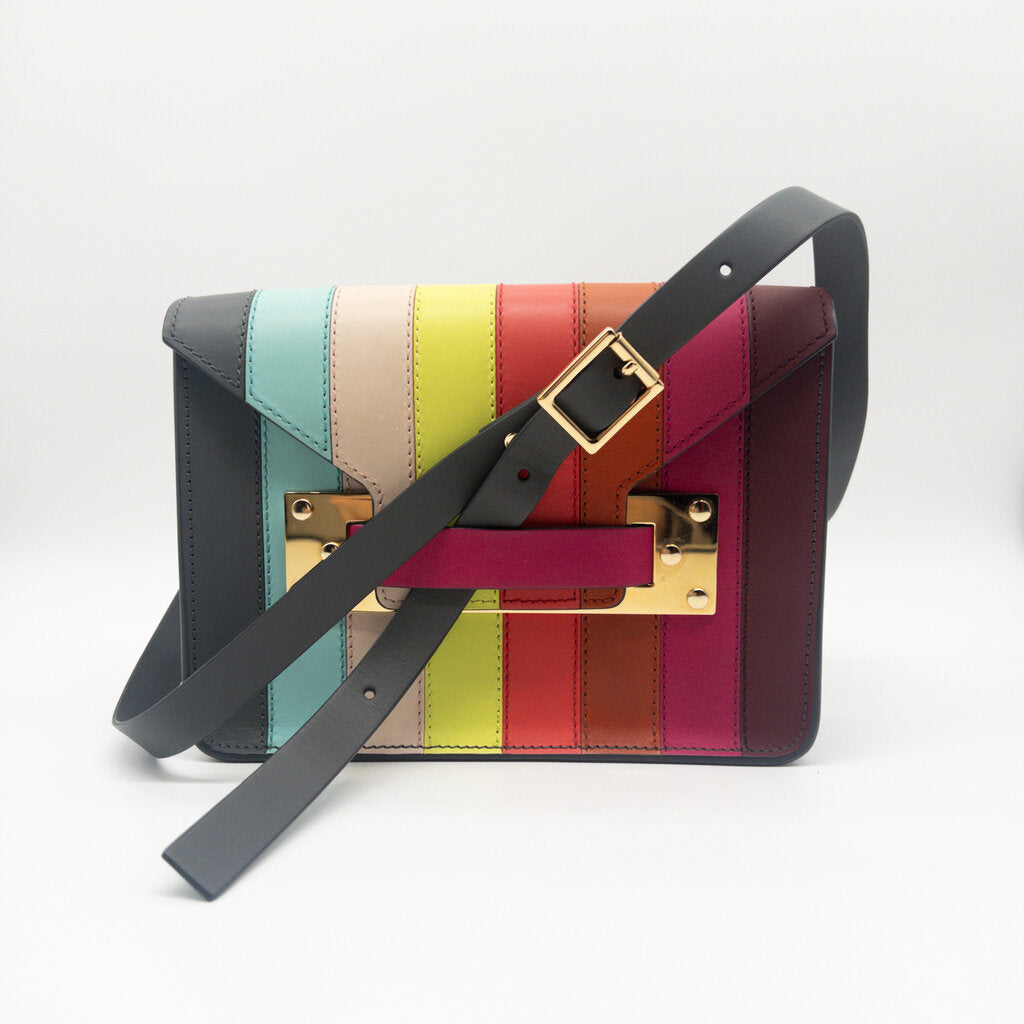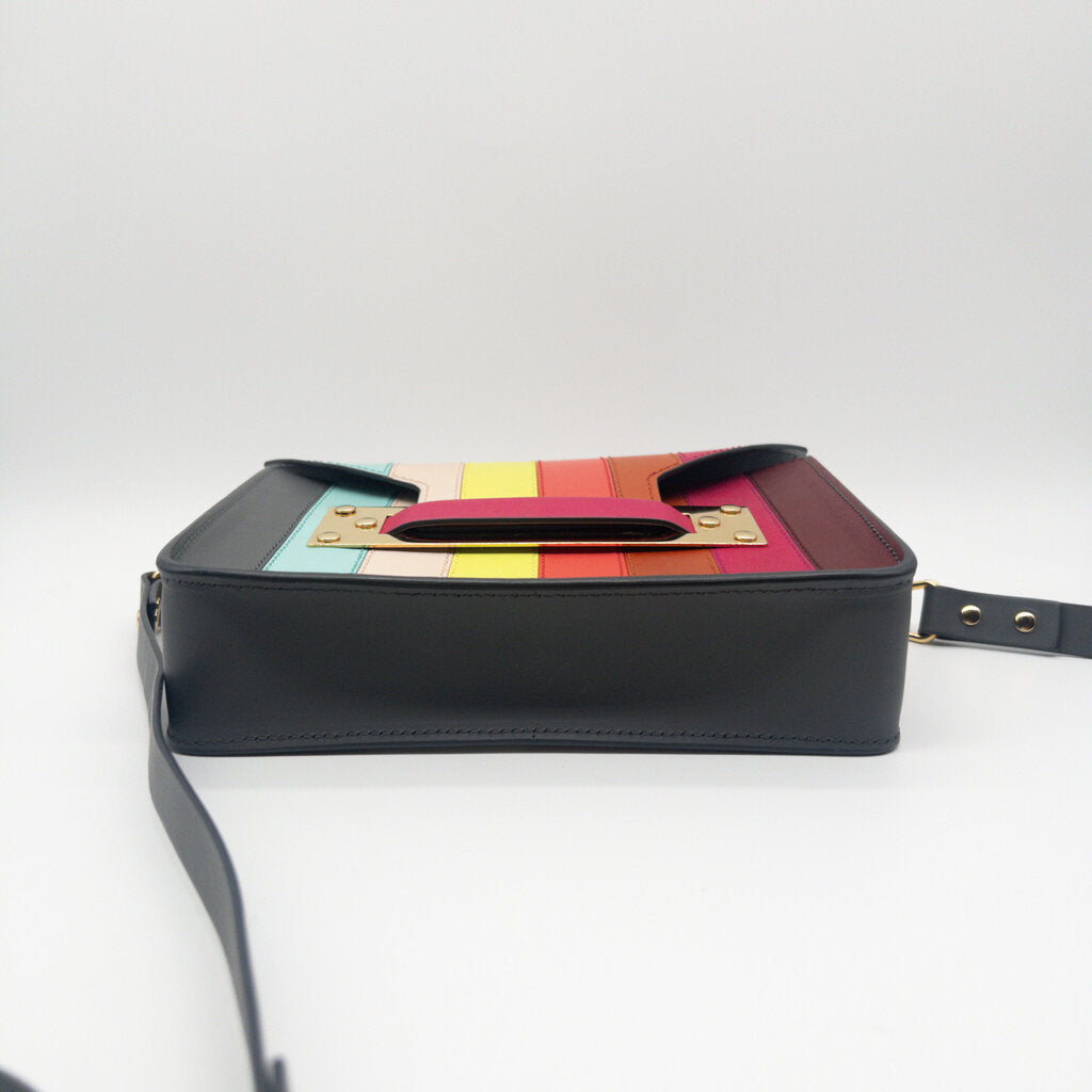 The brightest colour blocked leather bag to liven up your wardrobe. The Sophie Hulme Milner Mini is a beautifully constructed leather cross body bag, with adjustable strap, and colourful paneled leather detail. Shoulder strap can be lengthened / shortened between 50 cm to 59 cm.